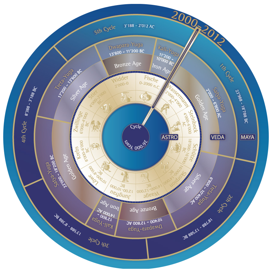 The 24,000-year duration of the complete Yuga Cycle closely approximates the Precession Year of 25,764 years, which is the time taken by the sun to ‘precess’, i.e. move backwards, through the 12 Zodiac constellations.