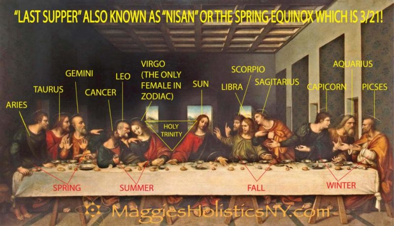 Paying close attention to the hand gestures of each of the disciples as explained by Hall, you would see that each one shows representation of a celestial zodiac sign. Starting with Aries at the head of the table and ending with Pisces. The only female in the Zodiac is the Virgo (Virgin) and is portrayed by Mary Magdalene the only female in the Last Supper.